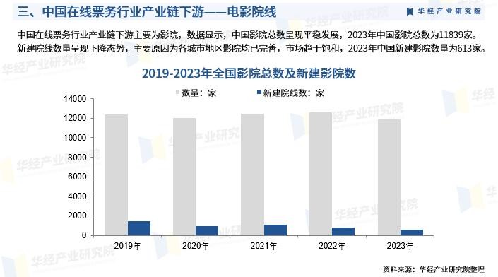 中国在线票务行业产业链下游主要为影院,数据显示,中国影院总数呈现平稳发展,2023年中国影院总数为11839家。新建院线数量呈现下降态势,主要原因为各城市地区影院均已完善,市场趋于饱和,2023年中国新建影院数量为613家。