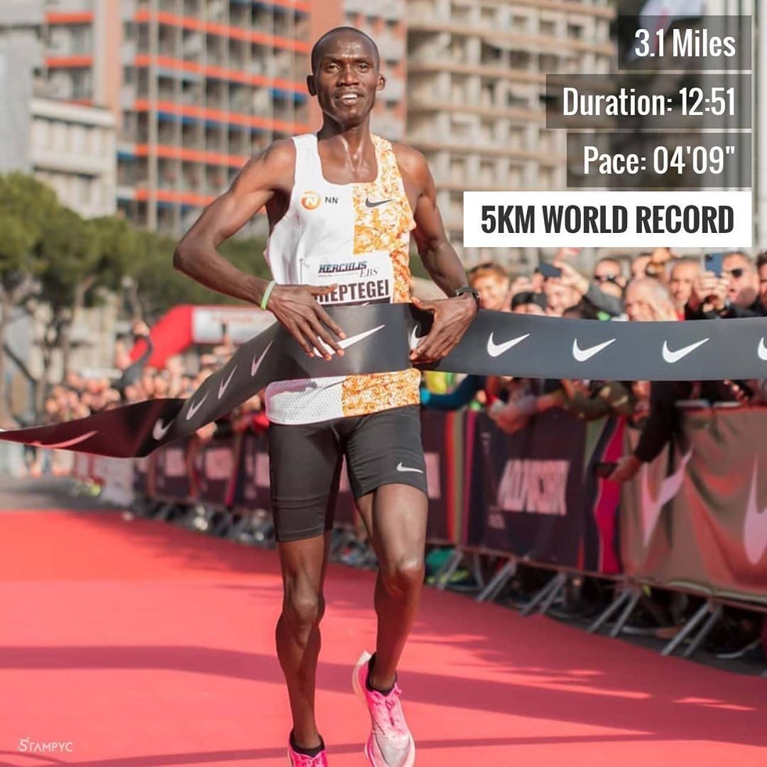在2019年9月15日的丹麦哥本哈根半马上,基普乔格的小老弟卡姆沃洛(Geoffrey Kamworor)把2010年由厄立特里亚选手泽森内·塔德塞(Zersenay Tadese)跑出的58分23秒提升了22秒之多,新的世界纪录是58分01秒。平均配速:2分44秒/公里。另外,虽然在2018年10月的瓦伦西亚半程上基普图姆(Abraham Kiptum)跑出来了58分18秒,由于其兴奋剂违规,成绩被取消。