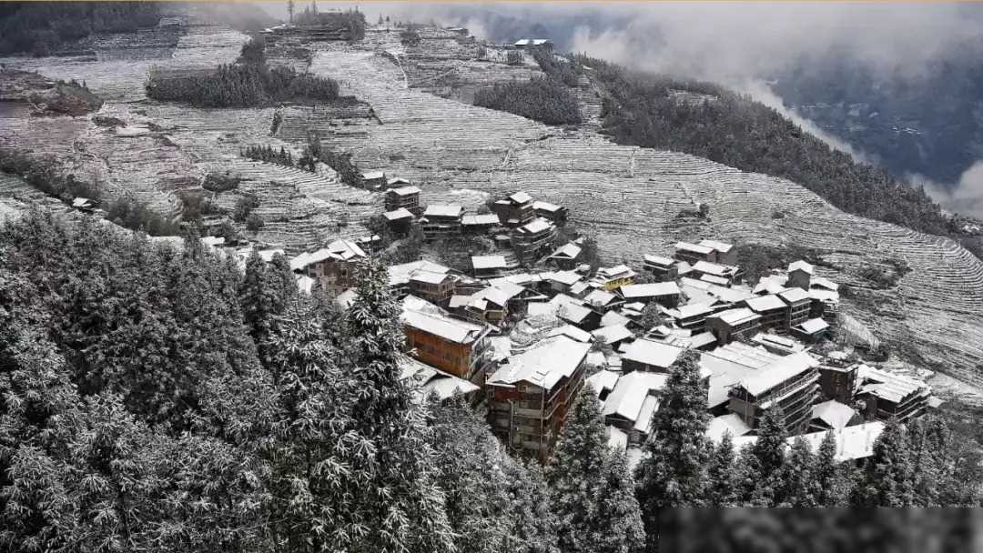 龙脊梯田,以其梯田美景而闻名,此刻更是美得令人陶醉。雪花轻轻飘落在梯田之间,如同冬日的精灵在山间起舞,将整片山川装点得如诗如画。龙脊成了雪的舞台,呈现出一幅宛如仙境的画卷。