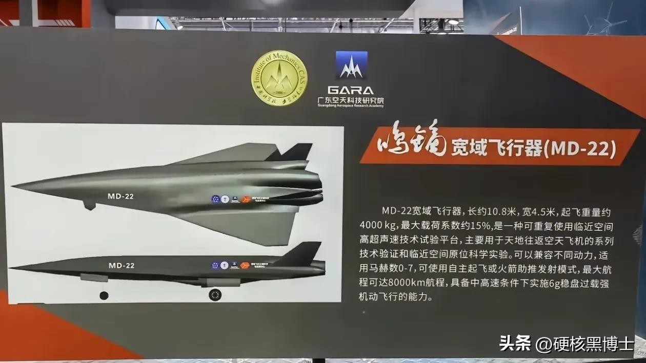这个MD22是什么?鸣笛22超高音速无人化战机,飞行高度估计可达100公里,这可是临近太空穿越大气层的高度,最大飞行速度估计高达7马赫。别说一般的导弹追不上,就连最低端的高超音速导弹都追不上(达到5马赫算高超音速导弹)!