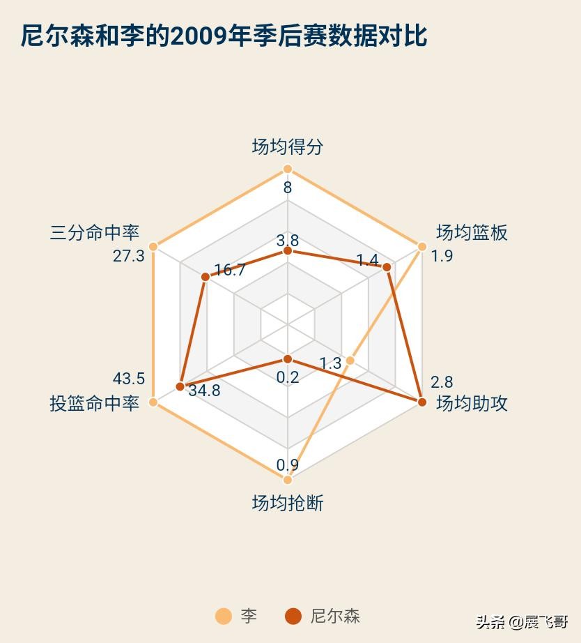 作为当时李的队友贾米尔·尼尔森,在当赛季入选了全明星赛,一直是队中的核心后卫,可是在那年的季后赛表现难有可圈可点之处,所发挥的作用也不及这位菜鸟。由于状态低迷,尼尔森的场均出场时间被控制在了18.0分钟,仅能交出场均3.8分、1.4个篮板、2.8次助攻、0.2次抢断的数据,投篮命中率为34.8%,三分球命中率为可怜的16.7%,拿着770万美金,表现确实缺斤少两。