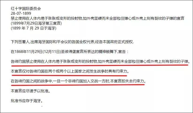 首先宣言规定说的是仅仅是战争不能使用,也就是说平时警用打击罪犯、狩猎使用等等都是没问题的。其次这只是针对签了协议的国之间而言的,如果说英国人去打未签署国,还是可以用这种扩张弹头的。