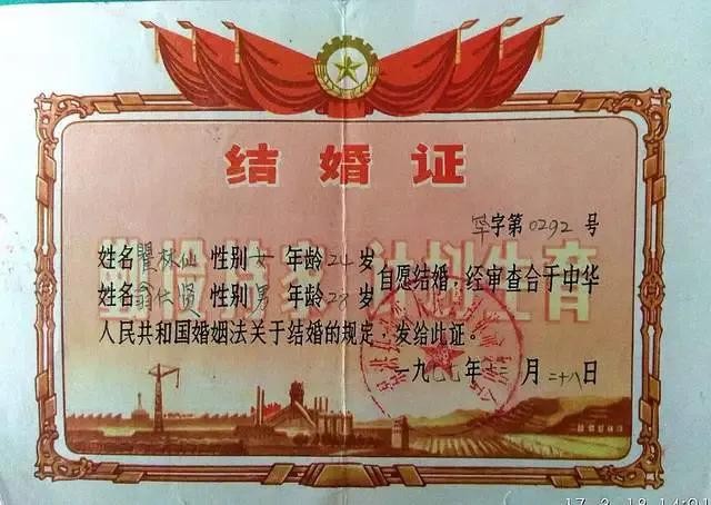 (云南兵团一师上海知青瞿玲仙与丈夫翁仕贤的结婚证,上海人玲林不分,办理人员听错后在结婚证上写成瞿林仙)