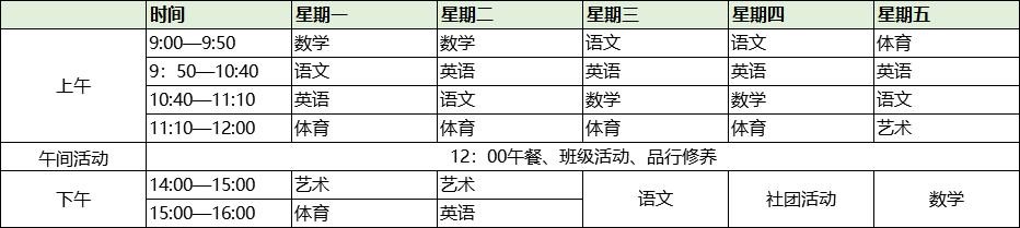 英语与体育特色:1—6年级每周英语课含英语和英语口语,达到每周4节以上,1—2年级开设武术,3— 4年级开设乒乓球,5—6年级开设篮球。同时,形体课、阅读课、生活课更是丰富了学生的学习课程。