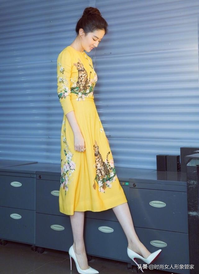 像“神仙姐姐”刘亦菲真的是白到发光的双脚,脚上踩着一双高跟鞋,一下气质感就出来了,显得高级大气,特别有女人味,在搭配上一件连衣裙,扎着一款丸子头发型,美腻了,如何穿搭都是那么的自然。