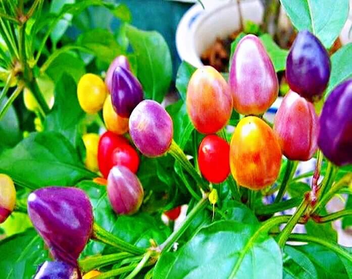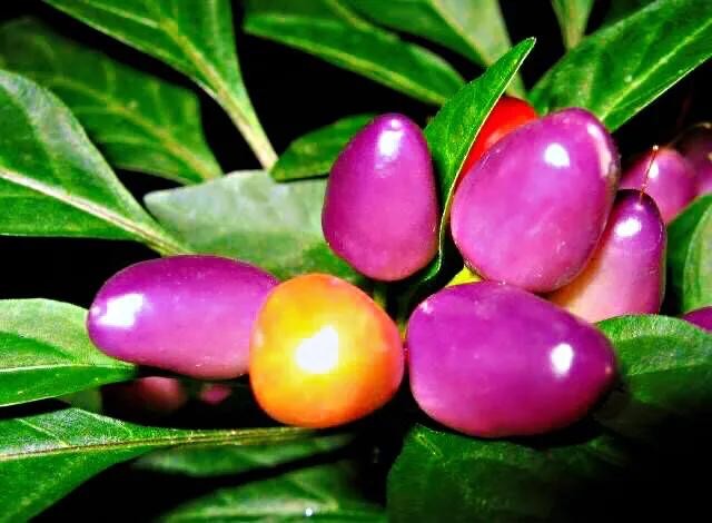 五彩椒,同株果实有绿、黄、白、紫、红五色,鲜艳夺目,光泽照人。是椒中珍品。