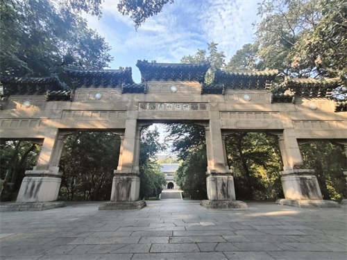 "灵谷胜境"挂在三拱门上,灵谷寺在灵谷景区内。