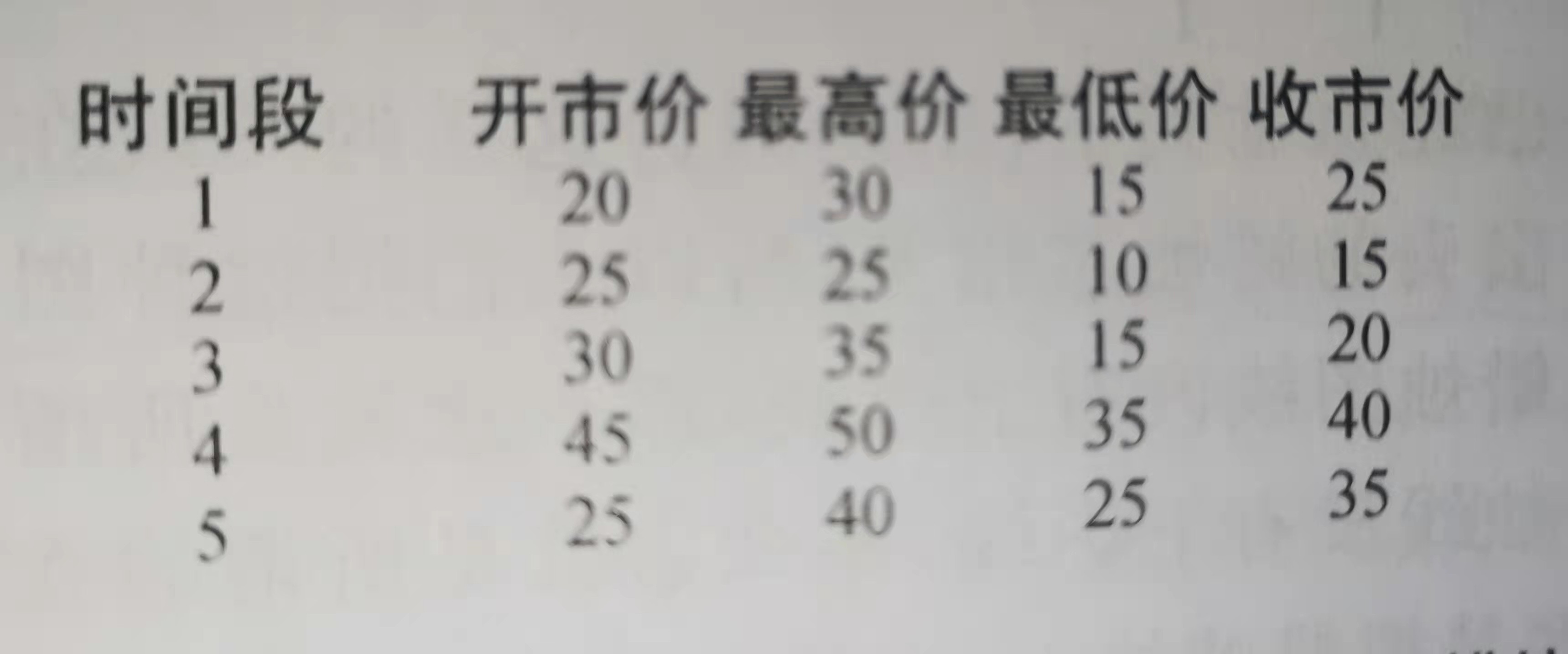 在下图中,首先列出了5组数据,每组数据都有开市价、最高价、最低价和收市价。