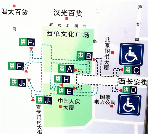 在上面的地图中,北京西单地铁站的地图的绿色的出入口,属于北京地铁4号线;红色出入口属于北京地铁1号线。、