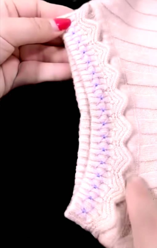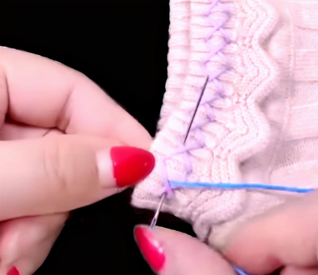 方法三:如果你会织毛衣花边,可以选择从领上约2厘米处剪掉。将剪掉的领口毛线拆下来待用。然后找到衣衣领口上的毛线头,再结合刚才拆下的领口毛线编织花边。或者也可以接其它颜色的线编织领口花边。