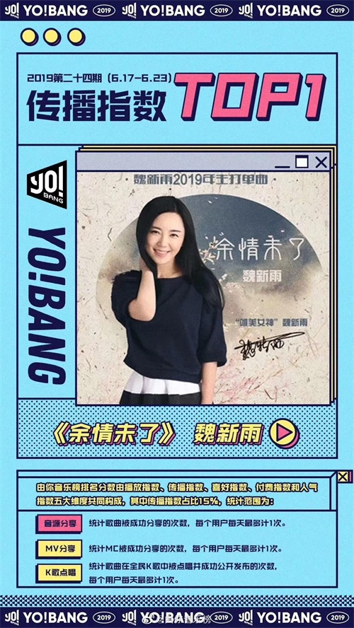 时隔四年间的时间魏新雨的音乐作品一直都是热温不断,2019年魏新雨继《恋人心》后,一年就连续推红了两首自己的作品,一首是2019年5月推出的《余情未了》,这首歌那可是推出不到一个月就红遍了整个网络和大街小巷。走在路上时不时就能够听到这首歌“叹人生 路兜兜转转与你余情未了,谁的笑飞过了天涯海角,挂眉梢。菩提下为浮生高歌一曲,多寂寥,月夜灯火阑珊浊酒一壶,醉倒在墙角”,朗朗上口,动听的旋律让人一入口就会唱。