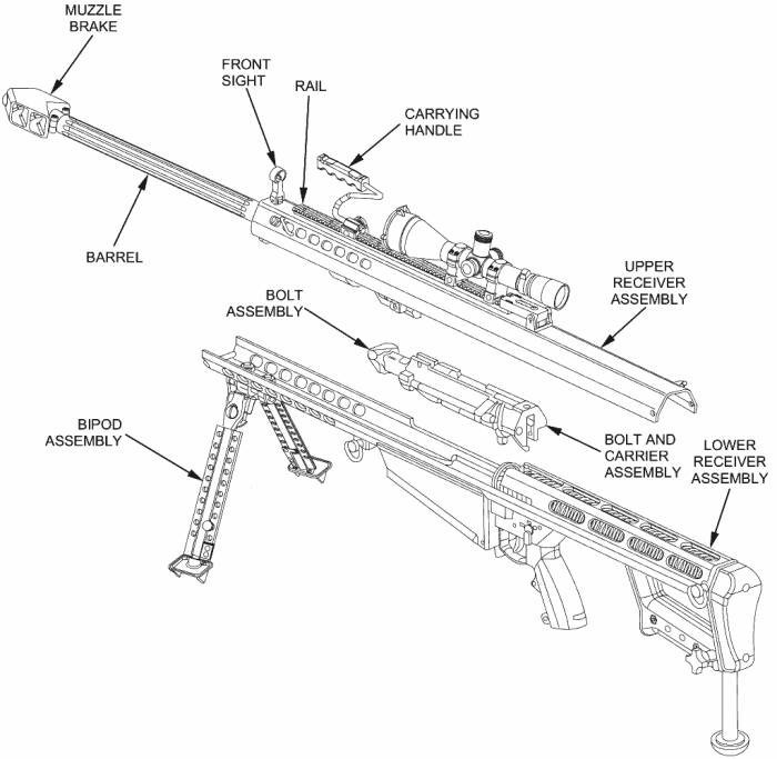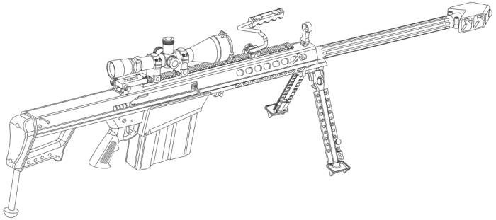 M107拥有一根长度和钓鱼竿差不多的超长枪管。 总长:1150 毫米 (48 吋)或1220 毫米 (57 吋) 枪管长:508 毫米 (20 吋)或737 毫米 (29 吋)