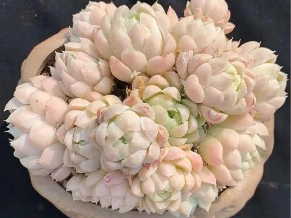 白月影叶片变白一定是在有温差的春秋季节,最理想的温差就是10-20摄氏度之间,夜晚温度五六度也很不错,配合充足光照,粉白粉白的,叶尖还会带点红。但要注意,长时间温度0度以下很容易冻伤,北方秋冬季一定要注意看天气预报,大降温之前记得搬进屋!