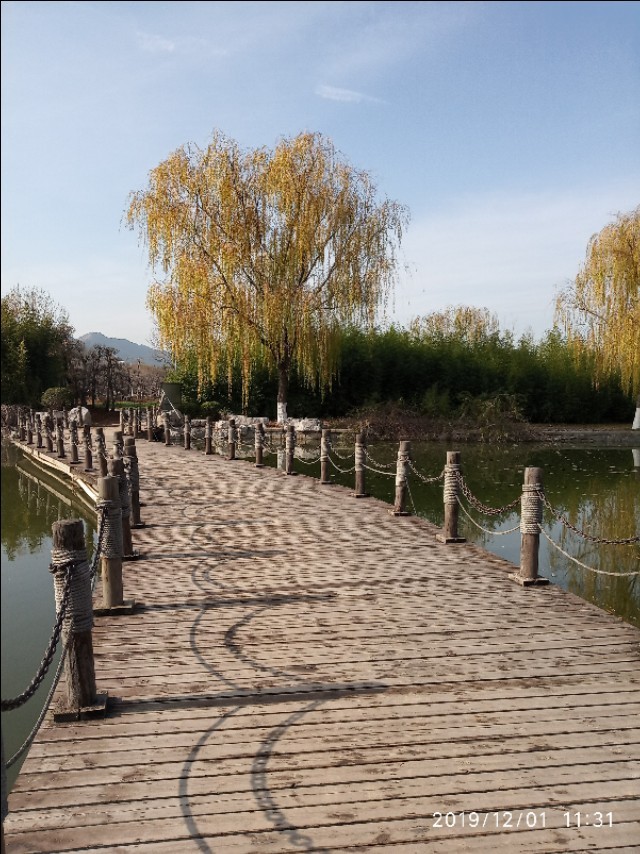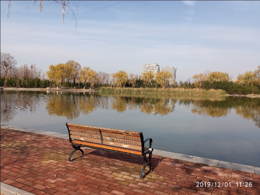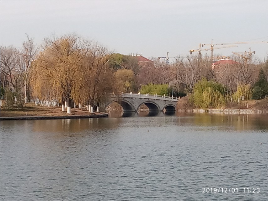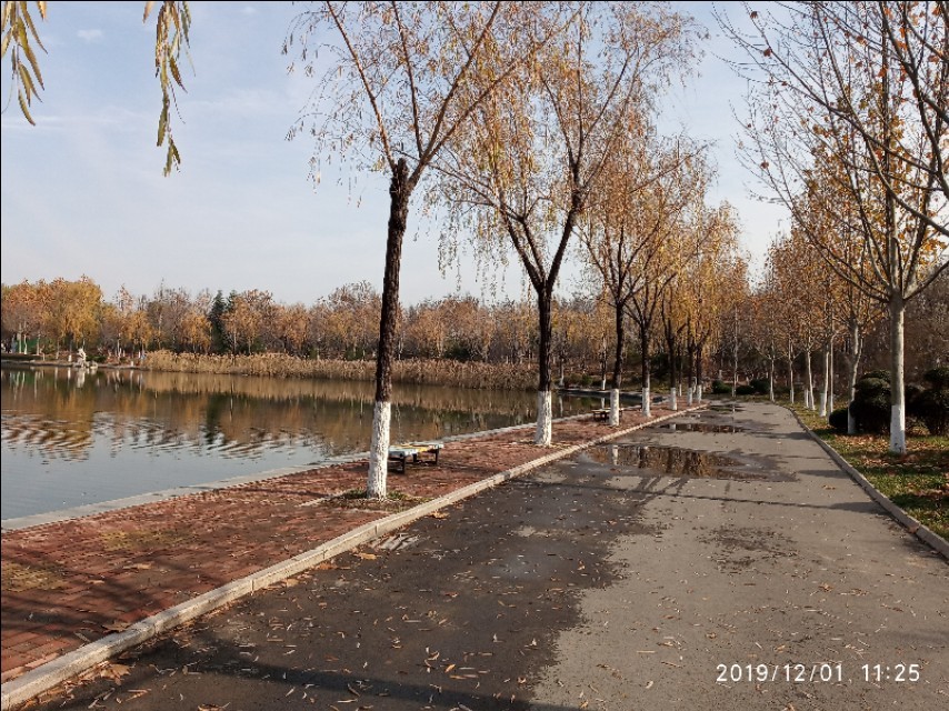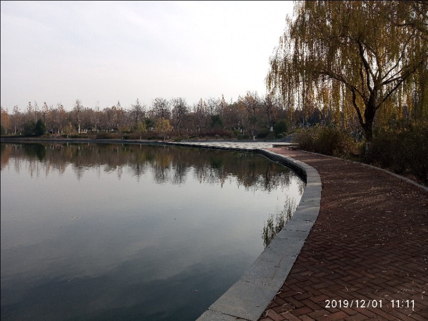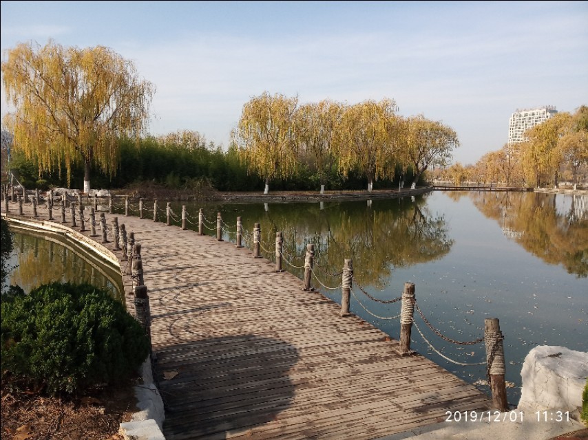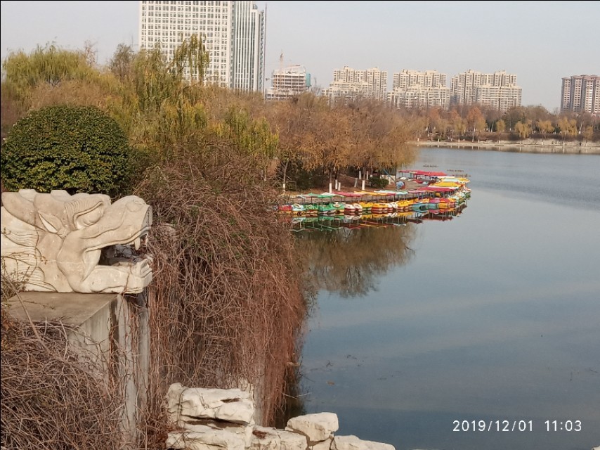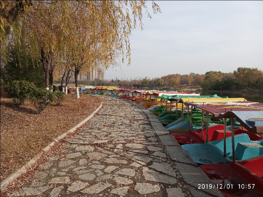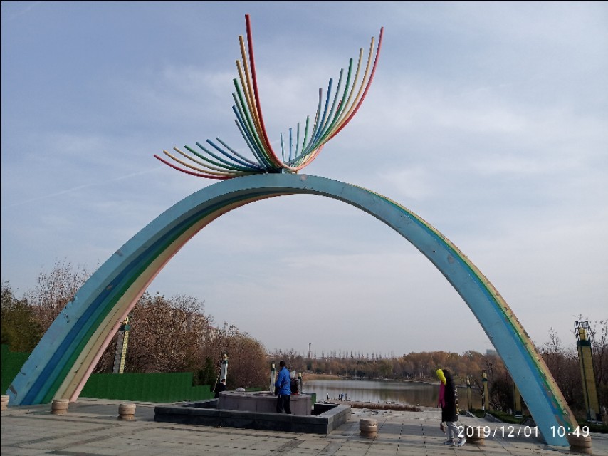 彩虹湖公园在济南高新东区,历城区春辉路6666号,距火车站约35公里,附近的公交车站--科创路春辉路,162路公交车在此站停靠。这里是彩虹湖公园西门,162下车后进此门方便。2019年1月7日下午,彩虹湖公园内发生地面垮塌湖面漏水,园区开始封闭整修。直到11月4日,园区才恢复开放。今天黄老汉乘公交车,几经周转才来到这里。老汉从公园西门进入,首先看到的是这座彩虹大门,它造型独特色彩艳丽,落在彩虹上的七彩蝴蝶,跃跃欲飞。彩虹湖公园南北长约700米,东西宽约450米,进入公园视野陡然开阔,心胸豁然开朗,彩虹湖还是那么美丽,树木、游船与湖波交相辉映,深秋景色格外宜人。拾级而下,湖面泛着层层涟漪,青山在湖中的倒影若隐若现,呈现出一幅人与自然和谐相处的美丽画卷。
