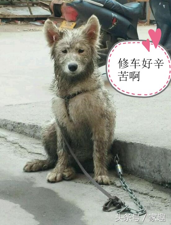 接下来看看劳模萨摩耶,这一定是刚帮主人修完摩托车吧,看这灰头土脸啊。