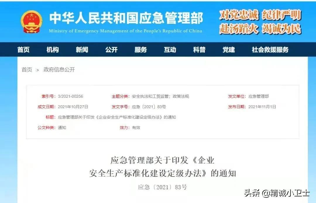 2021年11月1日起,应急管理部印发的《企业安全生产标准化建设定级办法》(应急〔2021〕83号)开始施行。