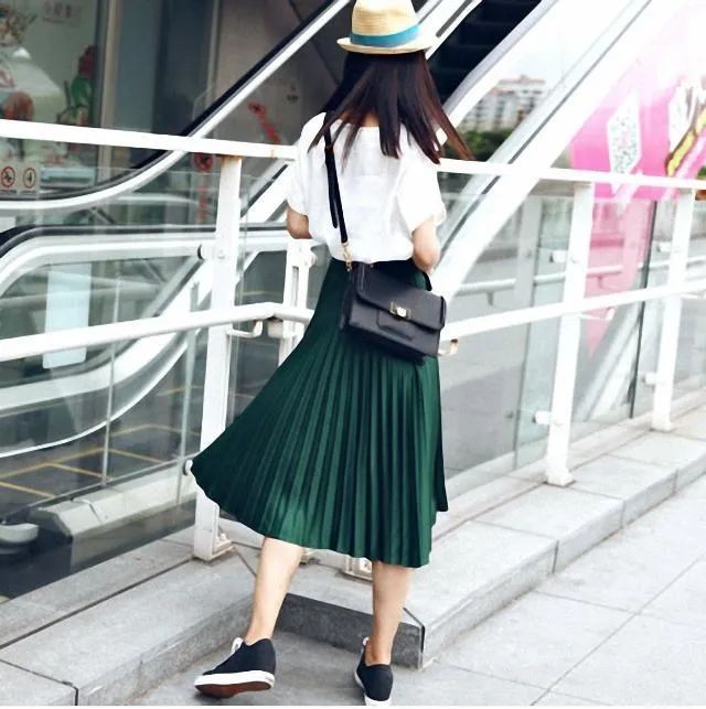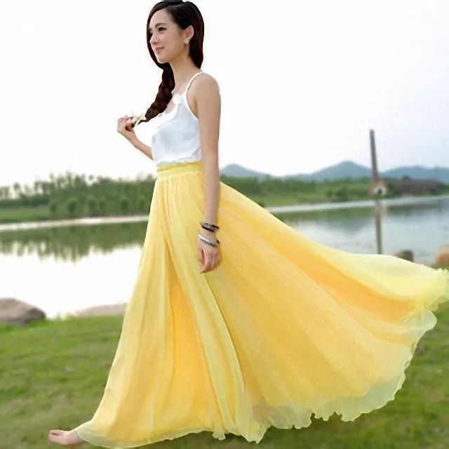 当你在郊外或沙滩度假时,这类长款的百褶裙,会让人越发的具有“仙气感”,吸睛度非常之高。在配色上也有众多选择,明媚的黄色、宁静的蓝色、浪漫的紫色和清爽的绿色,都可以让你成为一道靓丽的风景。穿搭时,多以半身裙的款式出现,远离面部不挑人,上搭背心、T恤、衬衫都毫无违和感。