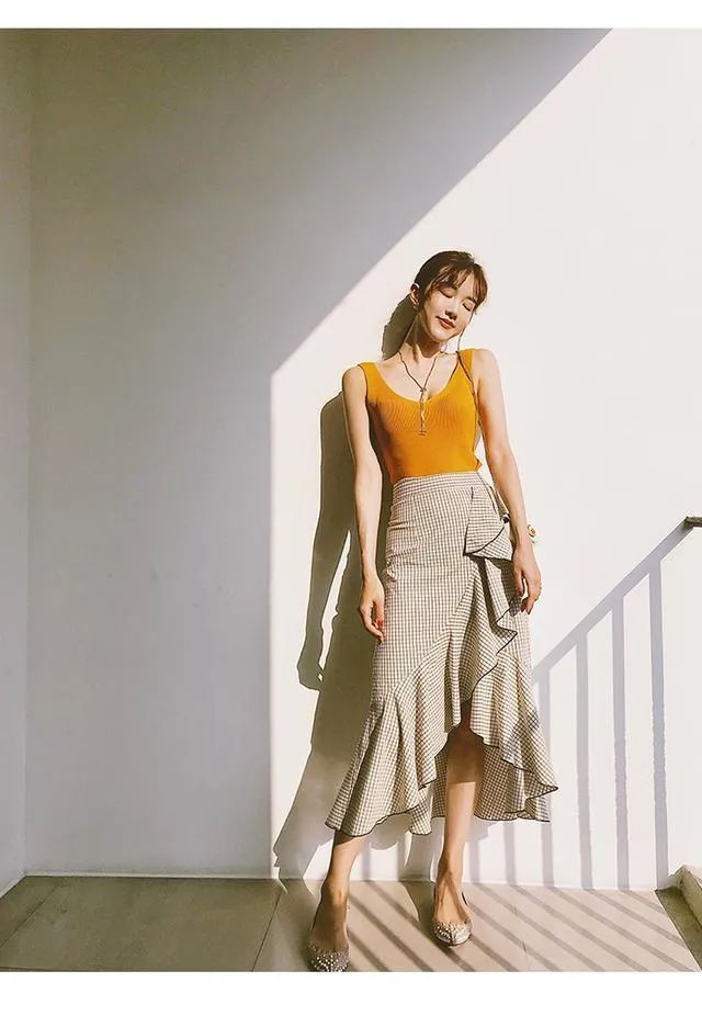 除了不规则的剪裁,还有荷叶边设计的百褶裙,让女性魅力得到更大释放,性感迷人中彰显知性优雅。穿着这种款式的百褶裙,也能极致拉长腿部线条,显得腿长身材高挑。穿搭时,上部尽量选择紧身款式,可以平衡整体穿搭,不会破坏荷叶边的“扩展”美感,搭配一双高跟鞋或穆勒鞋,比较具有优雅韵味,更显高级感。