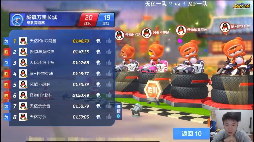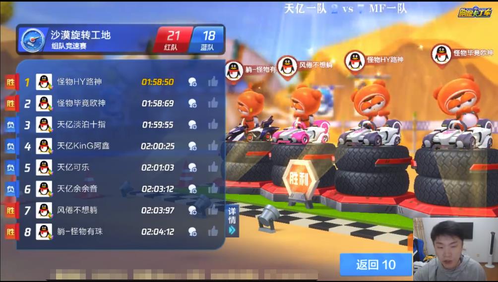 这场比赛是天亿一队和MF一队的比赛,天亿成员有大神玩家阿鑫,而MF一队有路神和欧神这两名大神主播,因此这场对决还是非常意思的,这也引来了专业解说小风的关注。在一开始的热身赛中,天亿一队成功获得了胜利,因此第一场比赛的地图是由天亿一队决定的,然而在第一场比赛中,起步阶段MF一队就获得了全面的领先,MF四人分别占据了第一名到第四名,但是阿鑫并没有放弃,随后阿鑫开始了长时间的追逐,最后阿鑫以第一名的成绩结束比赛。