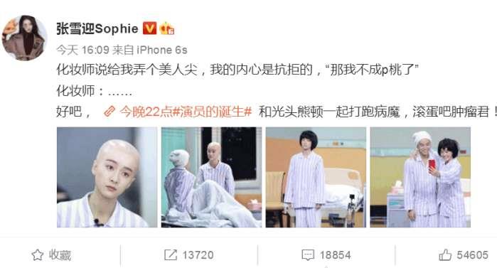 不久后张雪迎还向网友们分享她光头形象的样子,并晒出一些后台妆容的照片,看上去她此次饰演着一位患病的女孩子。只见张雪迎虽然已经化妆成光头,但一点都没能对她美丽的外貌产生影响,反而罕见的让大家再次重新认识到她精致的五官。