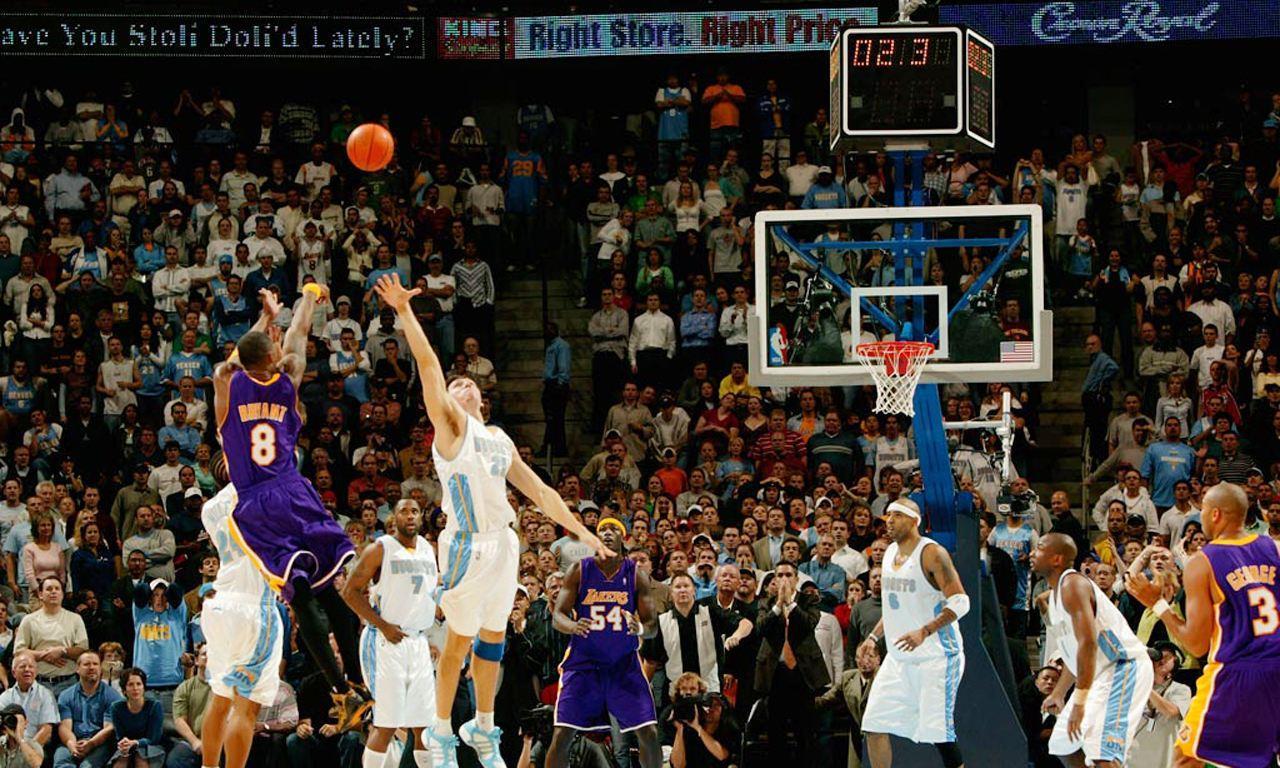 2002年1月2日湖人对掘金,终场前55.4秒,科比投球不中,但意外地抢到了这个篮板,并跳投命中,湖人87比86战胜掘金。在苍茫的雪域高原,丹佛的百事中心球馆,面对着哈达威的死缠烂打,科比始终没有太多砍分的机会,但是科比最终一击而胜。