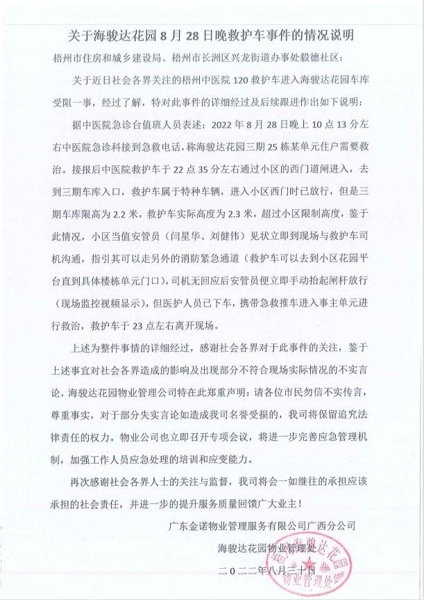 该情况说明显示,2022年8月28日22时13分左右,梧州市中医医院急诊科接到急救电话,称海骏达花园三期25栋某单元住户需要救治。接报后,医院救护车于当天22时35分左右通过小区西门道闸进入小区三期车库入口,由于该车库限高2.2米,救护车高度为2.3米,超过限制高度,因此无法进入。