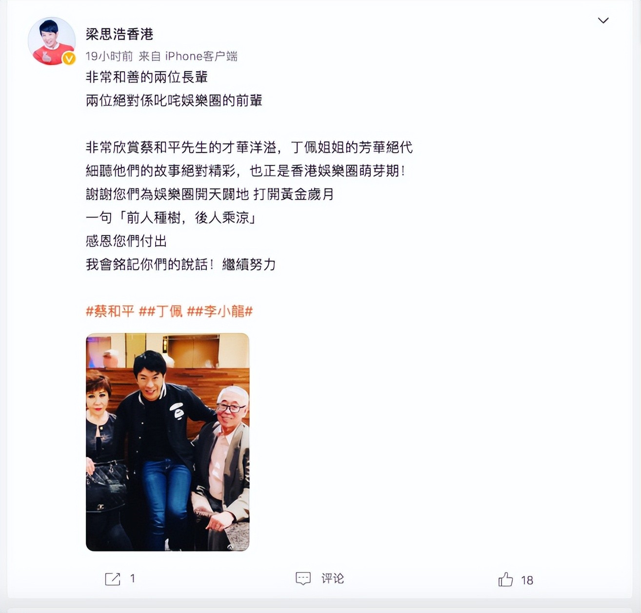 香港艺人梁思浩晒出一组他与丁佩,还有蔡和平三人的合影,原来他们三人当天晚上聚会了。