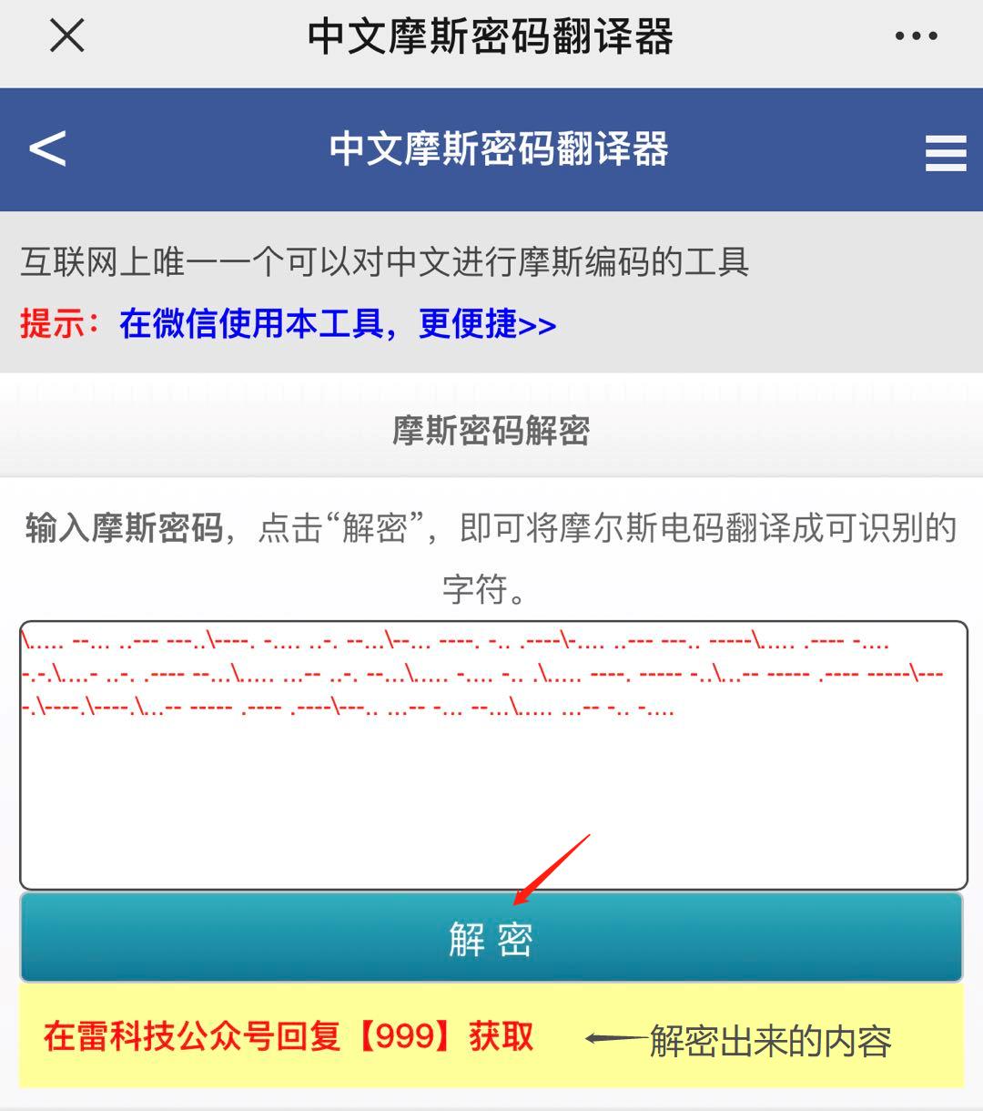 至于解密嘛也是一样的,只需要在加密栏上的"摩斯密码解密"栏,复制粘贴好友发过来的摩斯密码并点击"解密",就可以知道好友发过来的摩斯密码是什么意思啦!