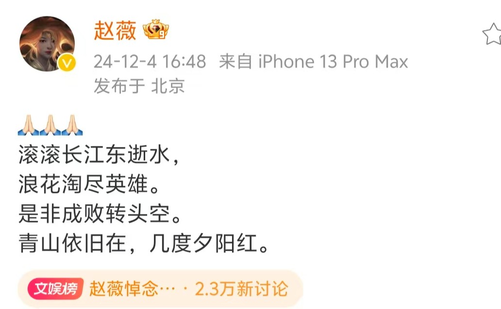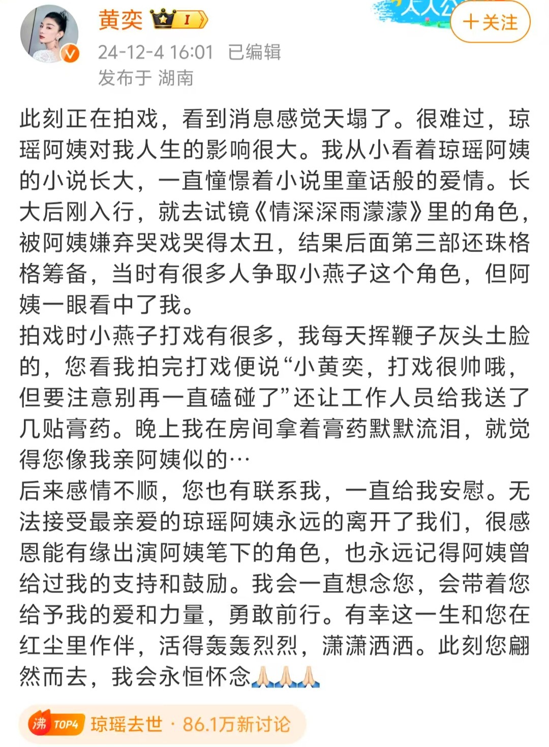 众星悼念琼瑶,小燕子时隔3年发微博,黄奕真诚,湖南台发文告别