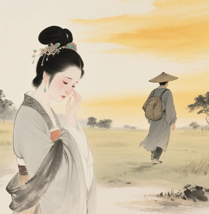 一位年轻人离开家,到王屋山去做道士,白发苍苍的母亲在门口啼哭,拉住他的衫袖不肯放手。他的妻子只有二十岁,被送回家时哭着穿过集市。