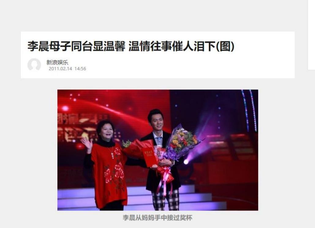 新浪娱乐——2011年2月14日——李晨母子同台显温馨 温情往事催人泪下