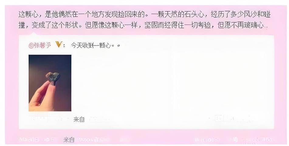 而张馨予为了记录这个美好的瞬间,在微博上晒出了一个李晨送给她的一颗“爱心石头”。