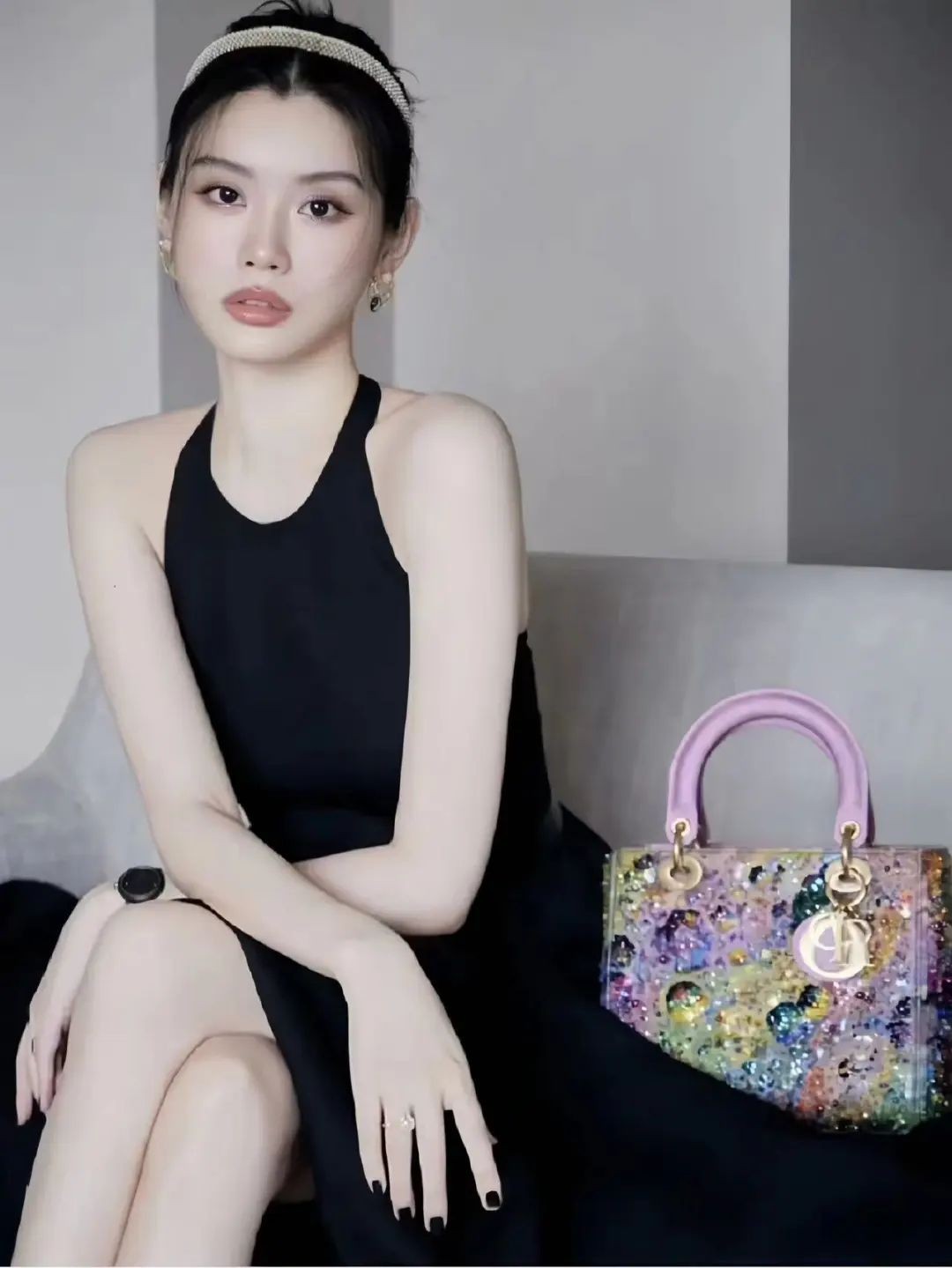 奚梦瑶拎过一只特殊款的Dior戴妃。有种缤纷人鱼姬的感觉。搭配小黑裙,显得优雅又有气质。