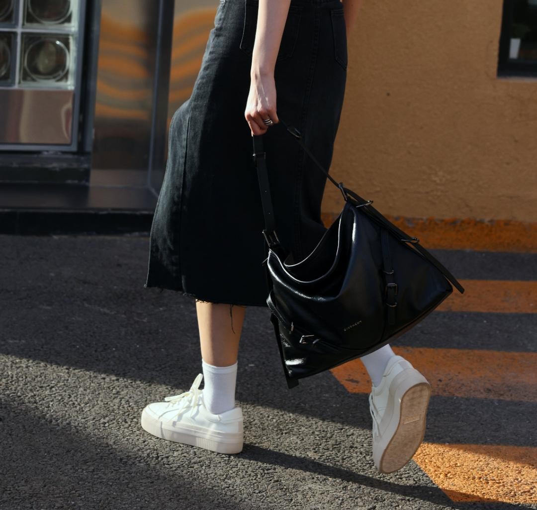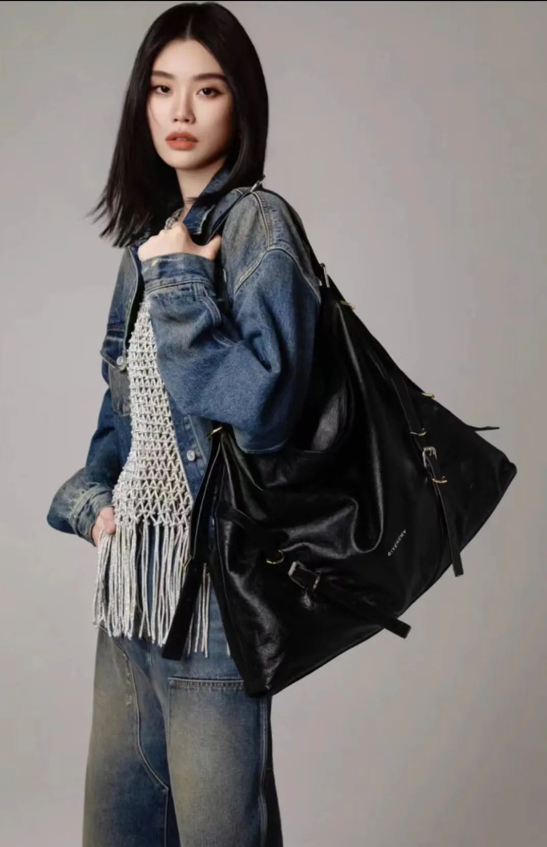 不过,虽然偏爱小包,但其实作为高妹(超模),奚梦瑶背起大包来更有范儿。 她这只Givenchy Voyou,算得上纪梵希热度很高的黑色包包了。
