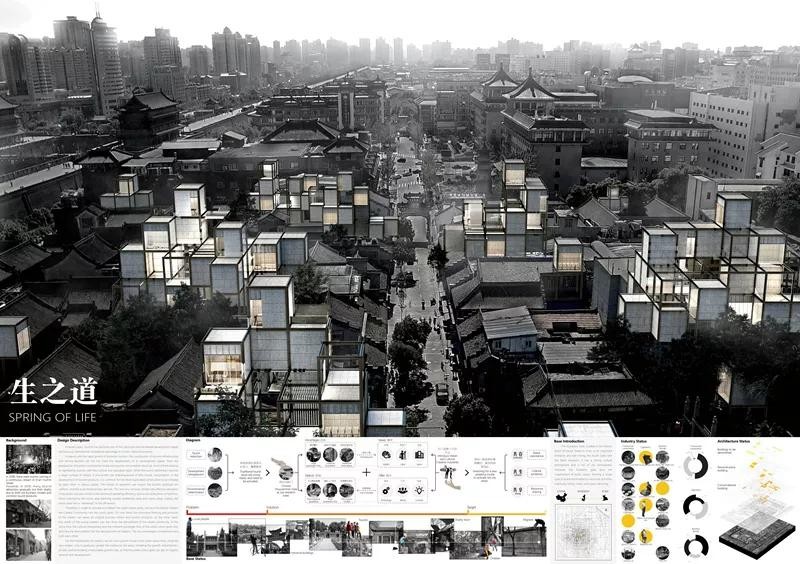 西安交大建筑学系本科生黄晓滢、佘欣艺、孙万齐在冯伟、贾建东老师的指导下完成的《生之道SPRING OF LIFE》作品,以具有深厚历史文化底蕴,同时具有完善传统产业基础的西安书院门地区作为基地,试图引入一个创客社区,该创客社区住户能够在APP上自由选择房屋位置、规模、材质等等,实现高度定制化,成为个人空间的设计者。作品利用科学技术刺激传统产业复兴,从而带动整个地区的自然更新,最终达到空间共存、文化共生、资源共享的理想状态。