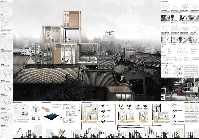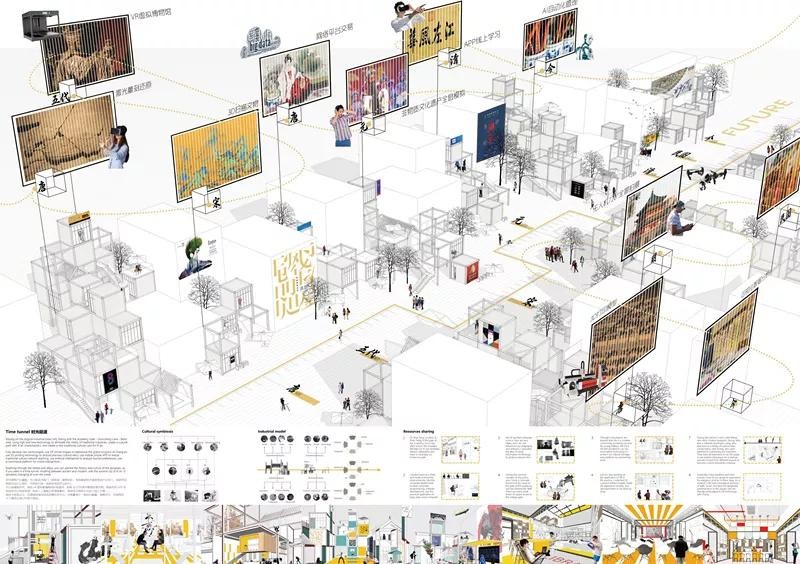 作品所呈现的愿景是书院门地区能够在原有历史积淀的基础上有机发展,古建筑与新建筑共生、原有产业与创新产业共生,重新焕发活力。人工智能、VR、互联网的介入与传统文化交织起来,营造出一个时光隧道,徜徉其中,仿佛梦回长安。最终经过激烈角逐,该作品突出重围,在国际建筑设计激烈的竞赛荣获嘉奖。
