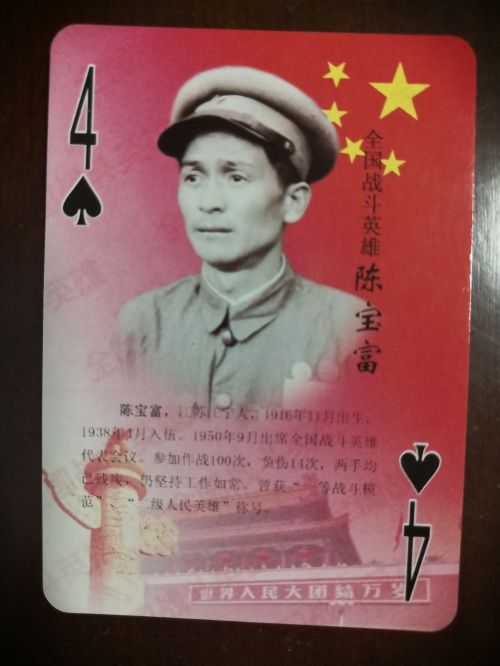 2、陈宝富,江苏江宁人,1916年11月出生,1938年4月入伍。1950年出席全国战斗英雄代表大会。参加作战100次,负伤14次,两手均残废,仍坚持工作如常。曾获“一等战斗模范”、“二级人民英雄”称号。