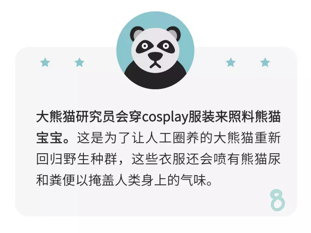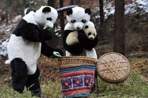 8、大熊猫研究员会穿cosplay服装来照料熊猫宝宝。这是为了让人工圈养的大熊猫重新回归野生种群,这些衣服还会喷有熊猫尿和粪便以掩盖人类身上的气味。