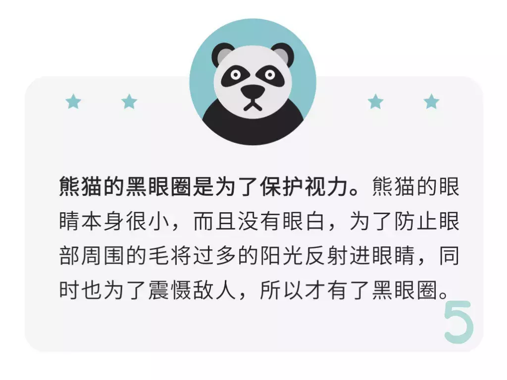 5、熊猫的黑眼圈是为了保护视力。熊猫的眼睛本身是很小的,而且没有眼白,为了防止眼部周围的毛将过多的阳光反射进眼睛,同时也为了震慑敌人,所以才有了黑眼圈。