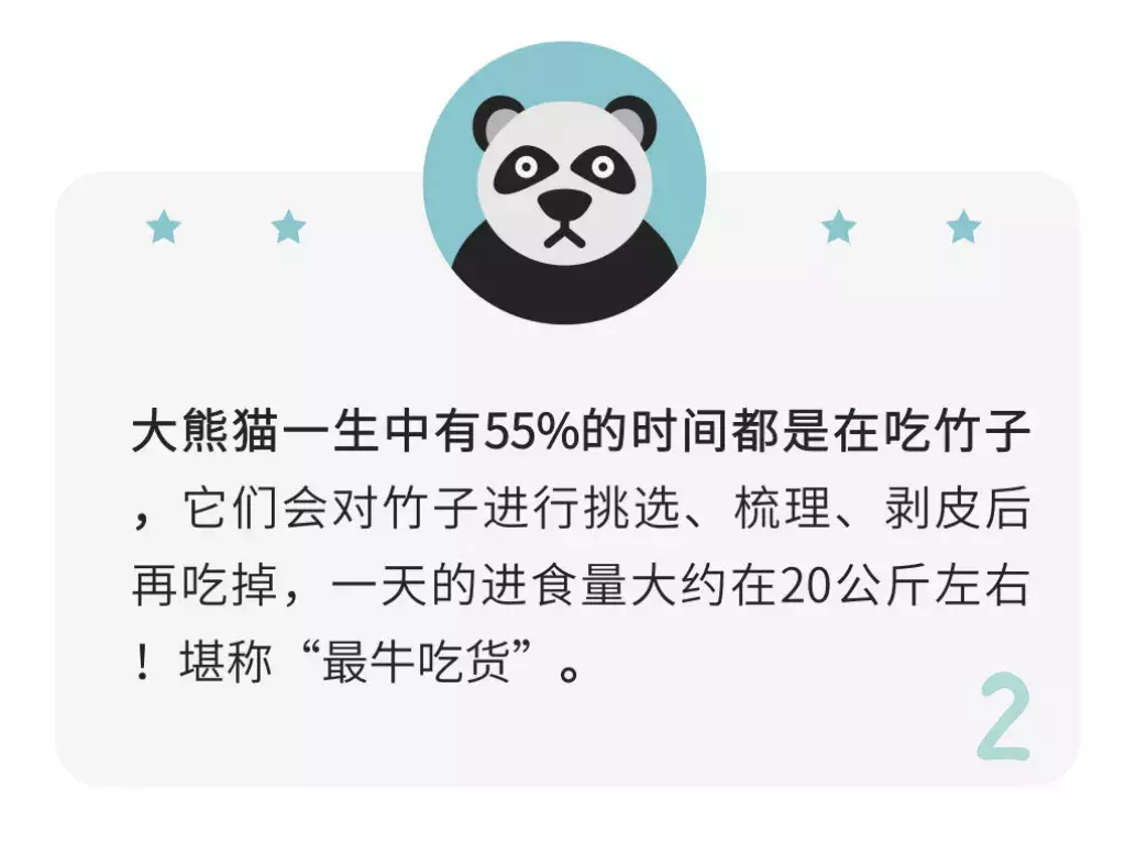 2、大熊猫一生中有55%的时间都是在吃竹子,它们会对竹子进行挑选、梳理、剥皮后再吃掉,一天的进食量大约在20公斤左右!堪称“最牛吃货”。