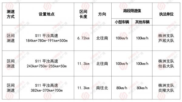 根据株洲高速交警所公示的测速路段,S11平汝高速株洲段沿线新增3处区间测速设备,以下为测速区间分布详情。