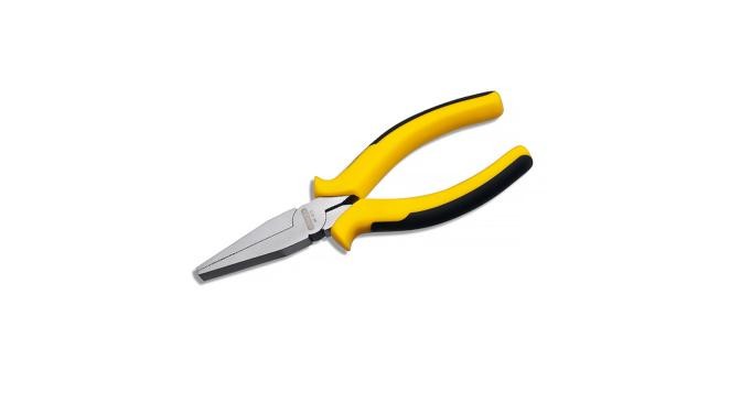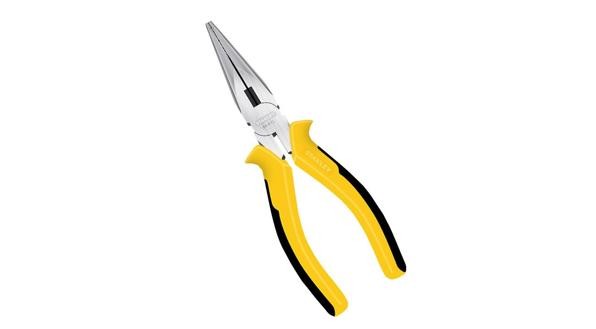 3、尖嘴钳,又称修口钳、尖头钳,用来剪切比较细的线,给线接头弯圈、剥塑料绝缘层等,因为嘴比较尖,所以可以在比较狭小的空间里操作。