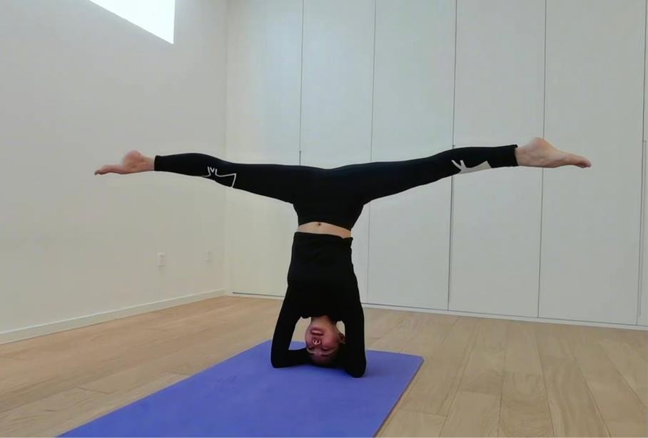 图中,关悦身穿黑色瑜伽训练服,露出小蛮腰,倒立劈叉,双腿展开成一字马。