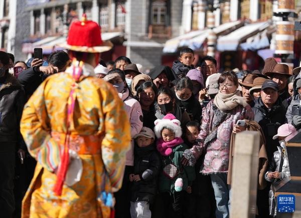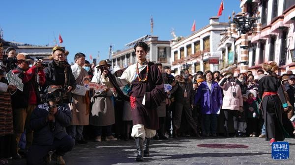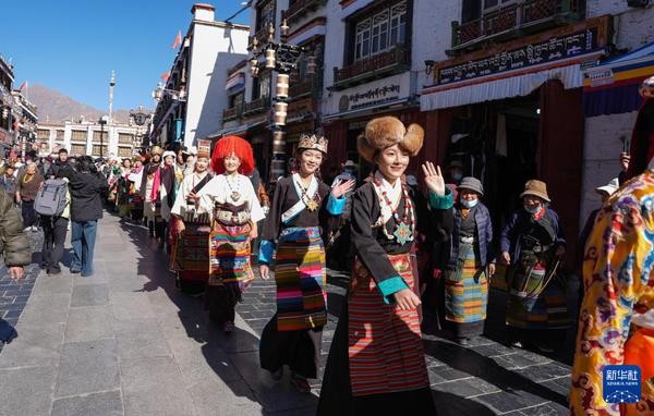 作为拉萨市文化和旅游局主办的“繁饰自然·衣彩拉萨——拉萨新年服饰秀”群众文化活动的一部分,1月3日,穿着传统藏装的模特巡游在拉萨八廓街。