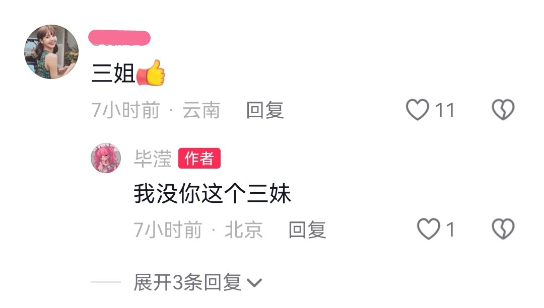 于是有人忍不住在留言区喊她,三姐,这么早上班。言下之意,讽刺毕滢去做小三,毕滢也没惯着对方,直接回怼,我没你这个三妹。