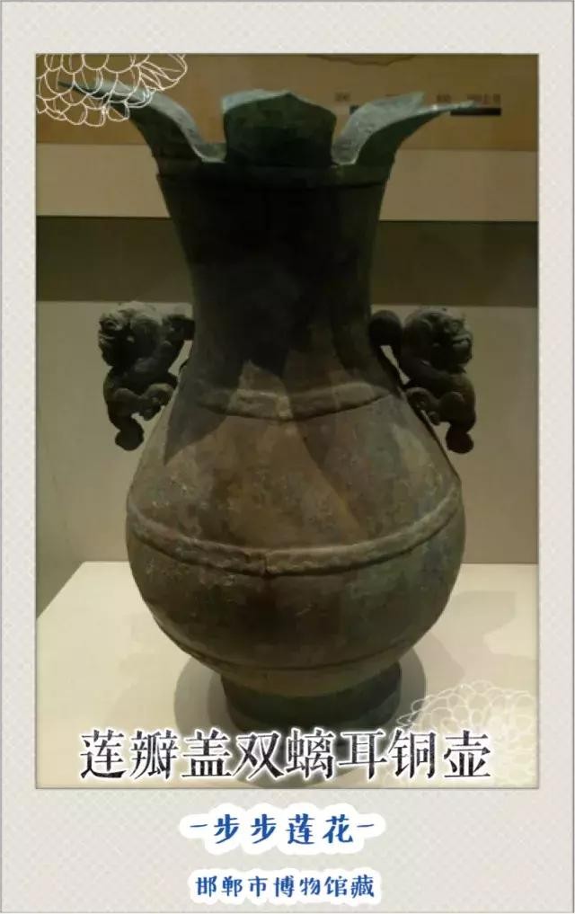 我们都知道,莲花是美丽高洁的象征,自古以来就颇受人们喜爱。它不仅经常出现在诗词中,还经常出现在器物的装饰中。现藏于邯郸市博物馆的莲瓣盖双螭(chī)耳铜壶就是以莲花为型而造的青铜器艺术品。