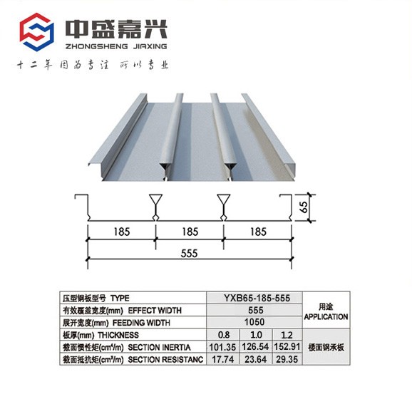 以中盛嘉兴生产加工的YXB65-185-555闭口式压型钢板为例:YXB65-185-555,65代表波高65mm,185代表波距185mm,555代表有效宽度555mm。