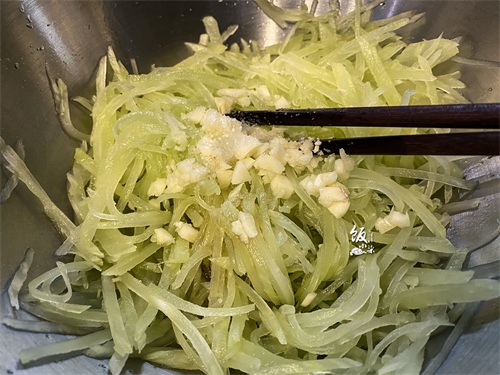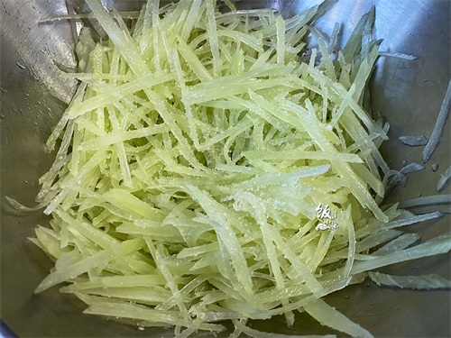 第三步,切丝之后清洗一遍,再放盆中,先加1勺白糖搅拌均匀,加白糖腌制过后,会更加有韧性,不建议用盐腌制,水分会流失过多。