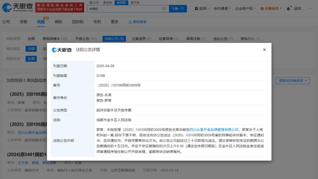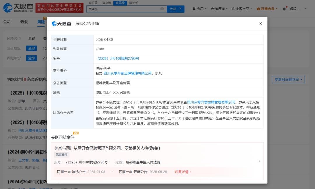 天眼查App显示,近日,成都市金牛区人民法院分别向四川从零开食品牌管理有限公司、罗某东、罗某琴公告送达关晓彤与其人格权纠纷一案起诉状副本、开庭传票等诉讼文书,自公告之日起经过三十日即视为送达,并定于举证期满后的次日上午开庭审理。