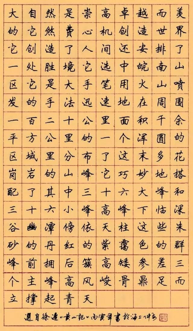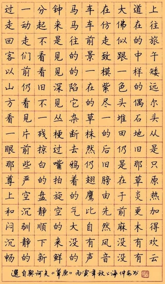 他擅长硬笔楷书和行书,其楷书非常温润细腻,尤其能够嫁接毛笔小楷的笔意,融入了更多小楷经典的用笔之道,写出了一番新气象,在他的硬笔书法中,表现的也是非常到位的,其硬笔楷书不仅细腻,而且还非常有温度,用笔上非常讲究,出入皆法,法度严谨,点画安排十分合理恰当,能够顾及点画之间的关系,这种关系处理的很是融洽,相互之间既能够体现出一种和谐的气氛,又能够体现出一种彼此依赖,首尾相连的关系,字形上以方方正正为本,虽然是硬笔书法,但是依然能够看到这种正大气象,而且这种正大气象表现还十分到位,可见他对楷书的认识是非常深刻的。